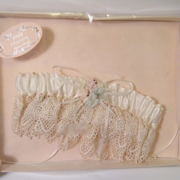 Lovely Old Fashioned Style Wedding Garter Belt from Simply Charming in original box. I do not know for sure if it had or had NOT been worn before, but appears to have a factory flaw in the elastic, twisted inside material. This is a so pretty cotton lace with nylon material flowers and ribbons. A country wedding themed look.