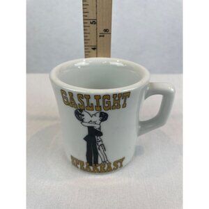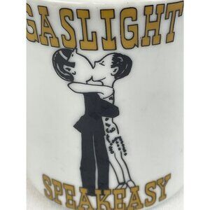 Fantastic, solid, heavy-duty restaurant-ware style coffee mug with an adorable 1920's flapper-era couple kissing and the words "Gaslight Speakeasy". I'm not sure the era in which the mug was made - very unlikely from the 1920s, possible in the 1960s, when this style mug would have also been more common. Whatever the case, it's a fantastic mug to add to any collection.