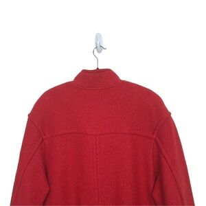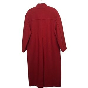 Red, 100% pure virgin wool, felted maxi length long coat with stand collar, 3 toggle button closures, and patch pockets. Preowned but in great condition.