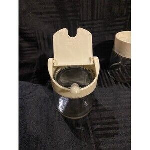 This is in great condition stored in a smoke free home nice set glass with plastic lids and caddy is plastic creamer is 4.25" tall sugar bowl is 4.25" tall caddy is 4" tall and4.5" wide