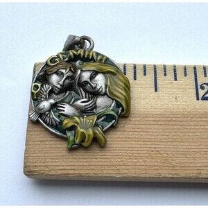 Vintage Gemini Twins Pewter & Enamel Charm Pendant Zodiac 3D Textured Green Ylw