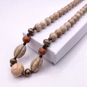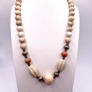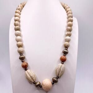 This vintage cream and pink jasper gemstone necklace from the 1960s is a beautiful midcentury piece crafted in a timeless beaded style. Measuring 17 inches, it features alternating soft cream and warm pink jasper beads, creating a natural and elegant color combination. In excellent vintage condition, this necklace is perfect for collectors or those who love unique gemstone jewelry.