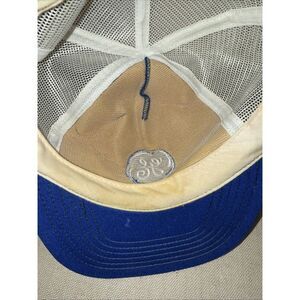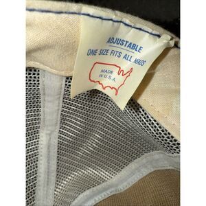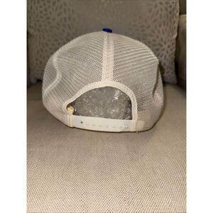 This is a Vintage General Electric GE Blue Snapback Trucker Hat Cap. It features a solid blue color with a mesh back, adjustable snapback, and breathable polyester material. The hat has a foam front panel and is one size fits all. Made in the United States, it is designed for casual wear and has a patriotic USA vintage style perfect for men of all seasons.