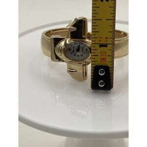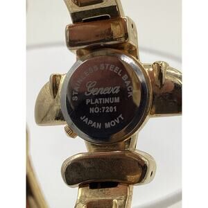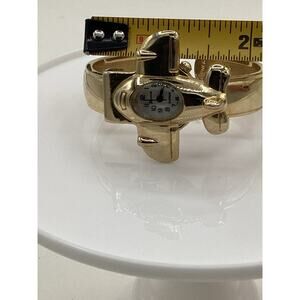 This vintage Geneve wristwatch features a unique airplane design with a gold band. The dial also has a gold color with a 12-hour dial and mechanical (automatic) movement. The case is made of platinum and the watch is styled as a casual or classic piece.