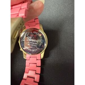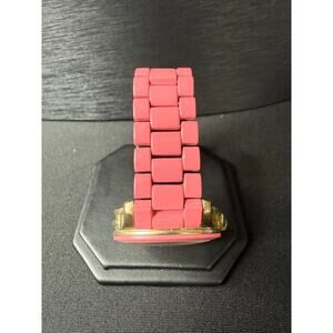 Tank style watch with Pink band/gold accents for your summer wardrobe. Metal band with gold tone closure. No damage to Crystal or band. 6.5” circumference when closed. Just needs a battery. Priced accordingly.