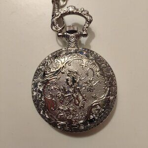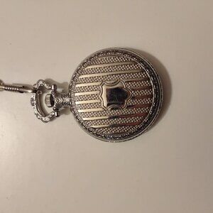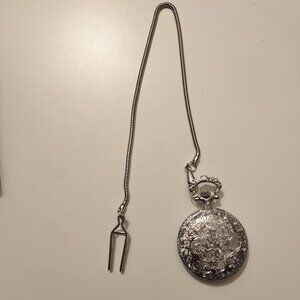 This vintage-style Geneva pocket watch features a polished silver-tone case with intricate design, a clear quartz dial, and a matching chain for convenient wear. WORKS-NEW