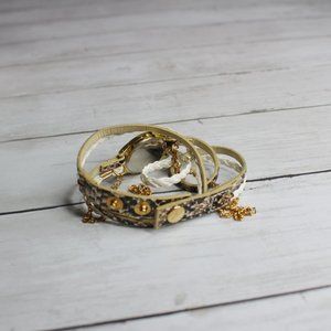This vintage watch has a gold tone face and wraps around the wrist with faux leather straps that are braided off white and brown and black animal print with metal chain accents. It fastens with adjustable metal snaps. It is in excellent condition with very minimal wear/scratching. There is no scratching on the face.