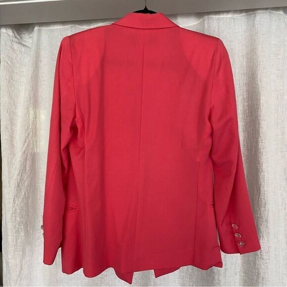 Genny Y2K pink double breasted blazer Barbie Barbie pink made in Italy luxe luxury designer 100% wool lightweight blazer polished fun girly preppy clear carved buttons career office street style boho bohemian indie Taylor Swift bright pink transitional season fun colorful statement blazer on trend preppy light academia workwear feminine tailoring