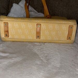 Beautiful Vintage Gently Loved Dooney & Bourke East West tote bag showcases a sophisticated yellow color with rich leather trim, offering a timeless and elegant design. Its structured rectangular shape and durable construction make it perfect for everyday use, while the top zip closure ensures your belongings are secure. Experience luxury and functionality with this classic tote. Please note this does need a lil cleaning.. nothing major.. Once you do that it will look Brand New this tote is gorgeous!