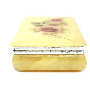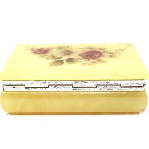 Vintage Genuine Alabaster Trinket Jewelry Box Yellow w/Flowers Created in Italy