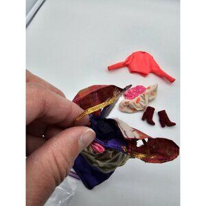 This is a vintage set of genuine Barbie clothing, including a red coat/jacket, dress, and boots. The brand is Barbie and the color is multicolor. It is a perfect addition to any doll collection and a great gift for any Barbie enthusiast. The set is complete with all the pieces mentioned and is in great shape. The gown has a strap that needs to be sewn otherwise Pre-owned in very good condition.