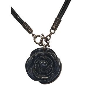 Stunning large carved Blue Lapis rose pendent paired with black leather rope chain necklace with 925 toggle clasp. Marked 925 Thai