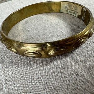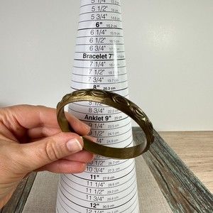 Vintage genuine brass embossed design bangle bracelet. Handmade, light. Size 8.25" (diameter). Comes with original sticker (see photos). Handmade in India. Has wear and few dents due to its vintage condition. Beautiful boho rustic style that shows age and unique decor.
