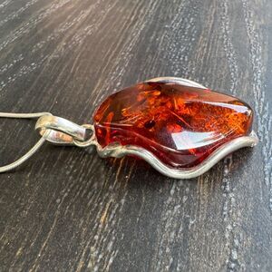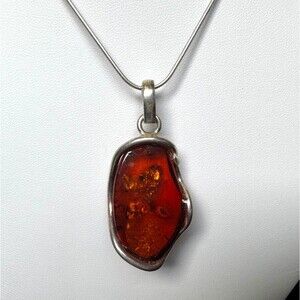 Vintage estate Genuine Cognac Baltic Amber pendant with 925 sterling silver frame and 18 inch snake chain necklace