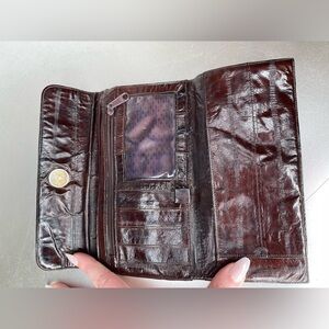 This vintage trifold wallet is crafted from genuine eel skin leather, a luxurious material that is both durable and stylish. The brown color and silver metal accents give it a timeless and classic look, perfect for any occasion.