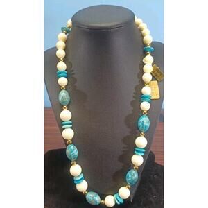 Vintage Genuine Fossil Necklace Blue Turquoise & White Golden Beads 22 - 24 In
