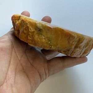 This beautiful vintage MCM piece is from the 1970s and was hand carved in Italy. Made out of a piece of genuine alabaster. Its truly a beauty and would be a great collectors piece. Top is smooth with natural stone sides and rubber bottoms. Measures approximately at its widest 4 1/2 x 4 1/4 x 1 thick. In great vintage condition with a little bit wear to some of the edges. Comes from a smoke free home.