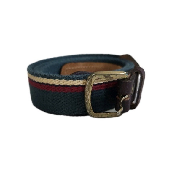 This vintage genuine leather belt in men's size 34 features a unique teal, magenta, and cream color combination with a striped pattern. Made with brass hardware, this belt is perfect for adding a touch of style to both casual and dressy outfits. With a theme inspired by the USA and retro vibes from the 80s and 90s, this belt is a statement piece that is both adjustable and versatile. Made in the United States, this belt is a quality accessory that exudes a sense of nostalgia and character.