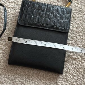 Good condition with minor use. See photos for wear, details and measurements. This elegant black crossbody bag is perfect for any occasion. Its sleek design and versatile color make it a must-have accessory.