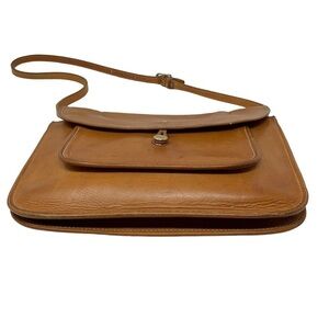 Vintage tan colored genuine leather commuter satchel bag. Brass button closure at front pocket; adjustable leather strap; dual main compartments under leather flap with raw leather interior. In good used condition; water discoloration at back exterior and missing a few stitches at top corner of front pocket as shown in pics above.