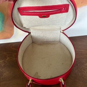 Genuine leather Pierre Cardin round handbag in bold red with heavy gold-tone hardware. Can be used as a statement purse or travel makeup bag. Made in the 1960s–70s, this piece has a true mod, space-age vibe.