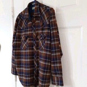 Vintage Genuine Roebucks Pearl Snap Shirt Men’s XL Long Sleeve Brown Plaid 100% Acrylic Flannel. Measurements are Pit to Pit:25" Length:31" Very Good Condition