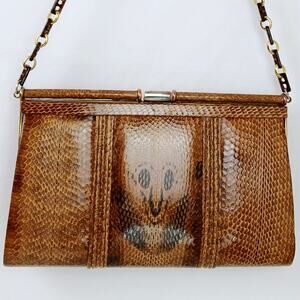 Vintage Genuine Snakeskin Clutch Purse With Chain Brown Cobra Head Markings
