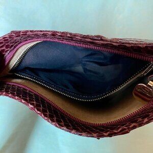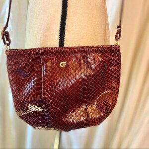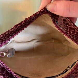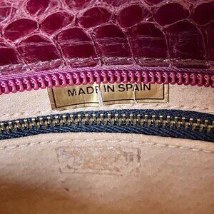 The snakeskin is washed in a beautiful rich burgundy color and has gold tone hardware. The inside is lined with leather and has one zip pocket. It still has the sticker stating “GENUINE LEATHER MADE IN SPAIN”.