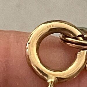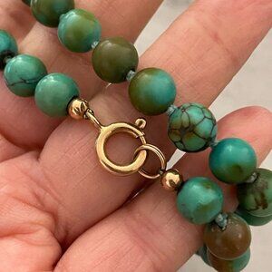 Round polished genuine turquoise stones of approximately 8mm in size are individually knotted on this 17" string necklace. These beads have lots of color and and markings--each one is more beautiful than the next. The large spring ring clasp is flanked by large gold beads and is marked 585 and has acid tested as 14K yellow gold. There is no maker's mark on this piece. I assume is it Native American but there is nothing to confirm this. This piece is very well made with soldered gold and dyed to match string.