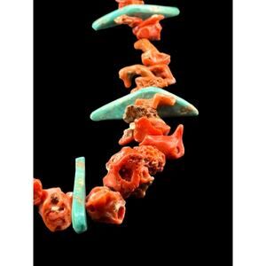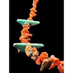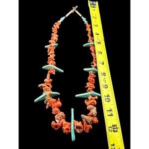 Vintage Genuine Turquoise and Red Coral Necklace 25” Long W Beads Hook Clasp