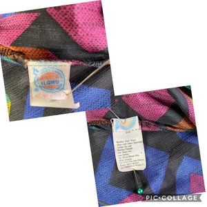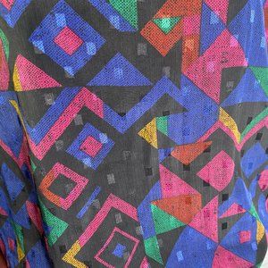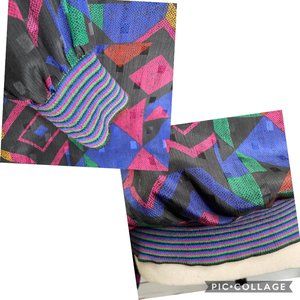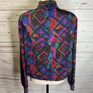 Amazing Vintage Blouse with Artsy Geometric Print in Blue, Magenta (Pink), Black, Green & Gold with ribbed knit sleeve cuffs and waistband to casual it up a bit