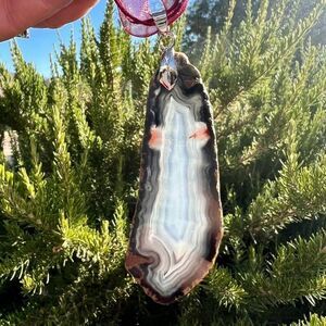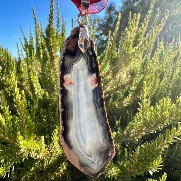 Lovely genuine polished Geode pendant in blacks, whites and reds. ~3" long with bale.