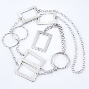 This bold and contemporary necklace features a series of open geometric shapes, including rectangles, circles, and diamonds, creating a modernist aesthetic.