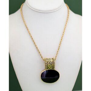 For sale is a beautiful vintage gold tone necklace that has an oval-shaped black pendant.
