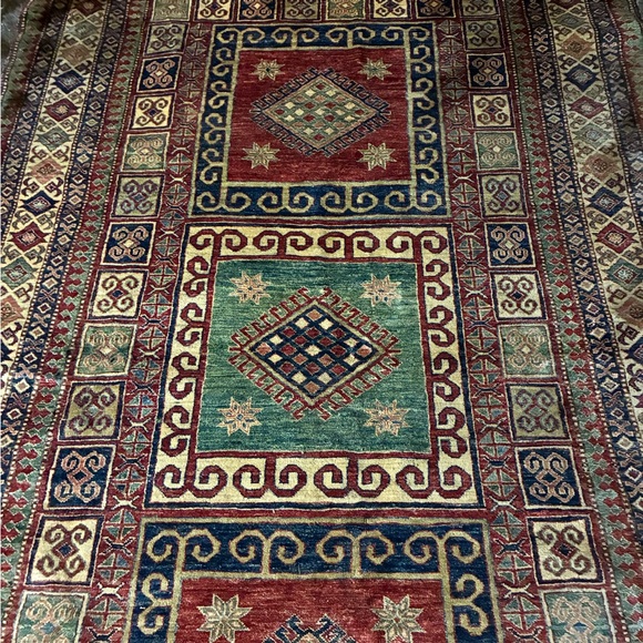 Beautiful vintage rug with intricate geometric patterns. Features rich red, green, and blue colors.