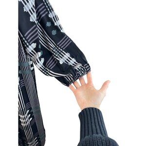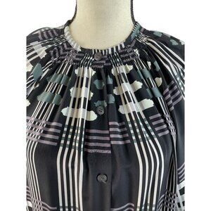 Geometric patterns and button-down design create a sophisticated style. Ruched collar and puff sleeves add unique flair to this vintage dress.