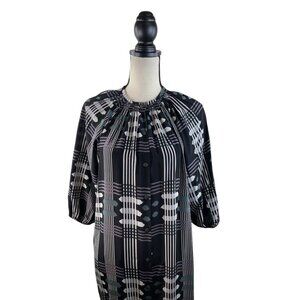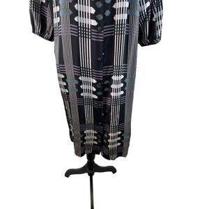 Vintage Geometric Print Black Button-Down Midi Dress With Ruched Collar & Puff S