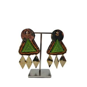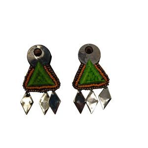 These unique vintage dangle earrings showcase a bold, geometric design with tribal and retro influences. Each earring features a large silver circular stud at the top, leading to a vibrant green triangular element framed by small orange beads, adding an earthy contrast. The textured green triangle gives a handcrafted, bohemian feel, while three silver diamond-shaped dangles below add movement and a metallic shine. Perfect for a statement look with eclectic charm.