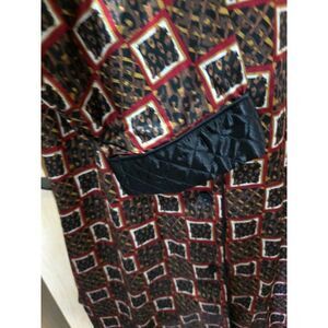 Step into the elegance of yesteryears with this vintage pajama top. Its satin fabric, adorned with a striking geometric print, exudes charm. The quilted collar and pocket detailing add a touch of sophistication, making it more than just sleepwear. A piece that whispers comfort and style in harmony.
