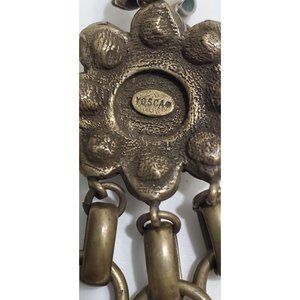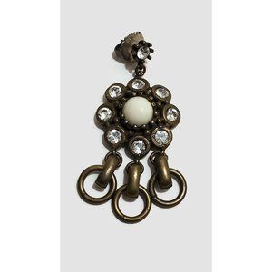This is a vintage pair of Gerard Yosca antiqued gold tone rhinestone and white glass cabochon designer earrings. They are signed on the reverse.