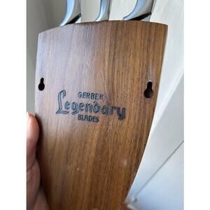 Vintage Gerber knife set in wood block and original box // there is obvious wear to the box as well as scratches on the wood and slight superficial imperfections on the metal (pictured) // Please see photos for details, measurements, and any minor imperfections // All items come from a smoke-free (but cat friendly) home and are sold as-is // We strive to use re-used, recycled, and biodegradable shipping supplies whenever possible // Thanks for shopping with Porch Light Vintage!!