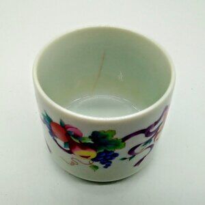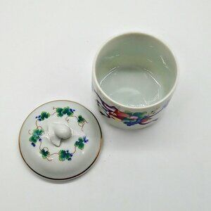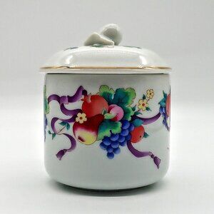 Lovely vintage covered white porcelain jar with gold trim surrounded with colorful fruit, grape vines and ribbons.