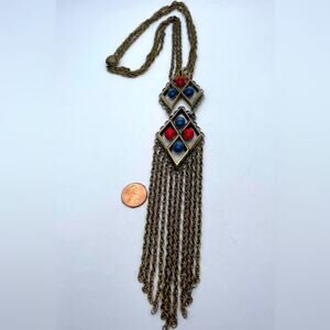 Vintage German Blue & Red Brass Tone Tassel Chain Statement Unique Rare Necklace