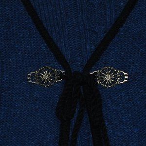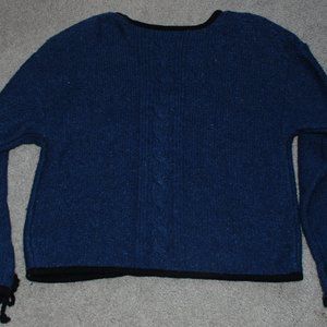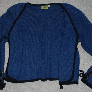 Up for your consideration is a Vintage German Cardigan Sweater by Country Blue which is in excellent like new condition (wore once or twice) and was personally purchased by me in Oberstaufen, Germany back in November 2000. This vintage cardigan sweater is a size Small and is blue with black trim and features silver metal German edelweiss flower hardware with black tie strings. This size Small cardigan sweater is made of 70% polyacryl (polyester) and 30% wolle (wool) with interior shoulder pads.