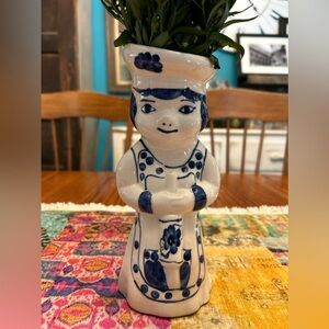 This vintage German ceramic vase features a hand-painted blue and white design of a mamsell with apron and rolling pin. The vase is medium-sized, measuring 3.5 inches in width and standing at 8.5 inches in height. The vase is an original, handmade piece with a folklore style and Germanic theme.