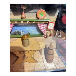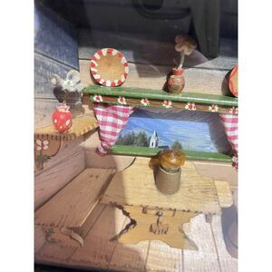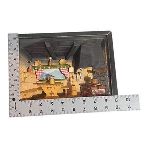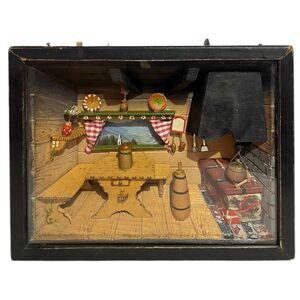 Experience the charm of German Folk Art with this vintage shadow box that captures the essence of a quaint farm kitchen. The piece features a delightful wind up musical song and a light, adding a touch of whimsy to its display. Crafted from wood, it showcases a colorful, multi-dimensional scene that brings the warmth of a rural setting right into your home. Measuring 6 5/8" in height and 9 1/8" in width, this small-sized shadow box is a perfect accent piece for any collector or enthusiast of German Folk Art.