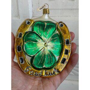 This vintage ornament features a green shamrock encased in a horseshoe with "Good Luck" inscribed. Imported from Germany, it adds charm to your décor. It measures 4.5x4". It is in excellent vintage condition.
