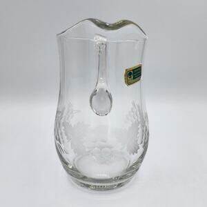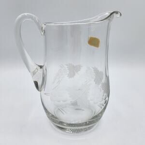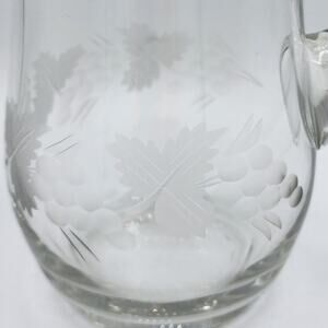 Vintage German Lausitzer Glas Etched Glass Crystal Handled Pitcher, Grape Leaf