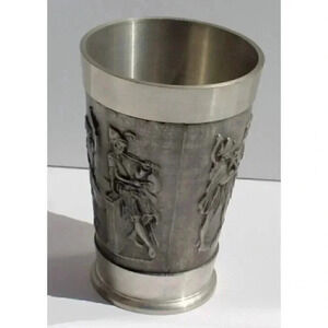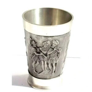 This vintage German pewter cup features a charming design of an old world folk scene with musicians playing the fiddle. Made of high-quality pewter material, this cup is a unique addition to any collection. Handmade in Germany, this cup exudes the skilled craftsmanship of the region. Perfect for avid collectors of metalware and pewter items, this cup is a must-have.