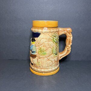 Selling a Vintage German-Style Textured Ceramic Decorative Beer Stein Mug. It measures 5.25" (h) x 3.25" (w), and features a mountainside landscape with a water wheel mill, and two men drinking together at a table. Has some crazing beneath glaze, but it's in otherwise very good condition!